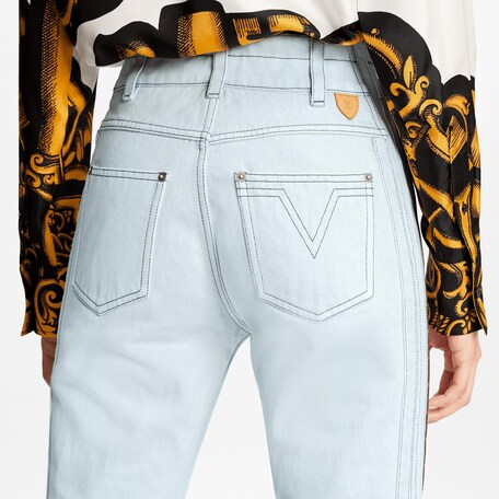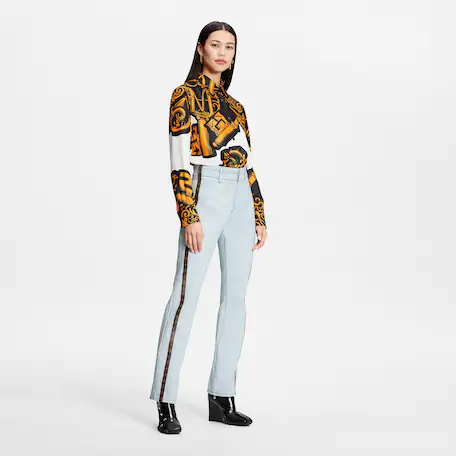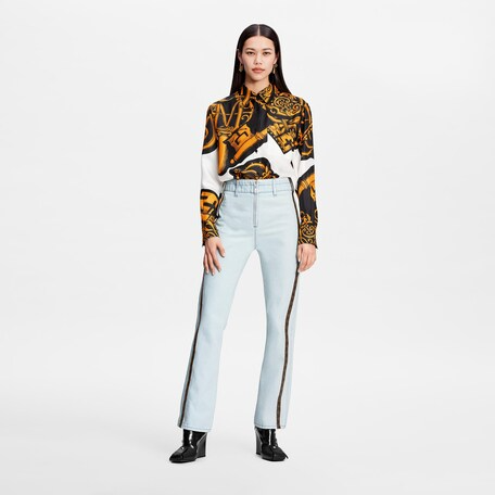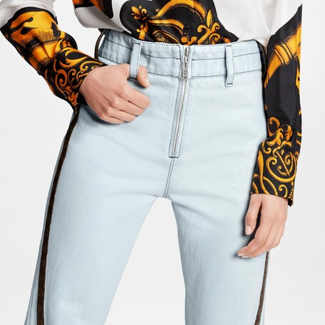 컬렉션을 대표하는 디자인에 상징적인 포인트 디테일을 더해 선보이는 워시드 데님 진. 오가닉 면 소재. 뒷면 포켓 부분의 V 디테일을 더욱 돋보이게 하는 대조적인 오버스티칭. 바깥 솔기를 따라 길게 이어지는 모노그램 캔버스 스트립으로 플레어 핏의 날렵한 실루엣을 강조한 아이템. 노출 지퍼. 가죽 소재의 LV 서클 패치.