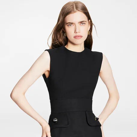 2022 크루즈 컬렉션을 대표하는 날렵하고 미니멀한 실루엣의 감각적인 리틀 블랙 드레스. 세련된 면 실크 피케 소재로 완성한 무릎까지 오는 길이의 실루엣. 여성스러운 체형을 돋보이게 하는 잘록한 허리 라인. 패션쇼에서 선보인 반짝이는 혼 버튼으로 장식한 골반 부분의 두 개의 플랩 포켓. 현대적인 감각을 더하는 뒷면의 노출형 지퍼.