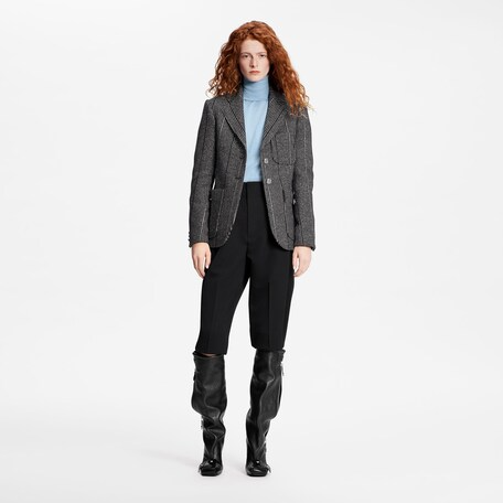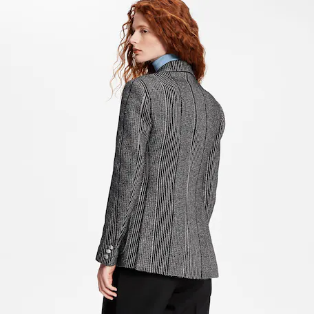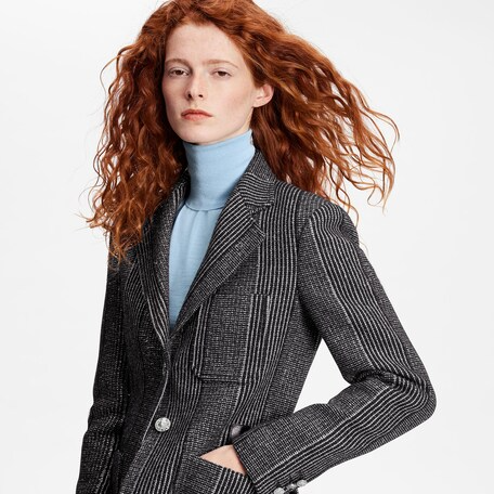 아름다운 반짝임이 돋보이는 싱글 브레스티드 블레이저. 컬렉션을 대표하는 스트라이프 울 캐시미어 혼방 루렉스 트위드 소재. 패션쇼에서 선보인 스터드가 달린 탭으로 강렬한 포인트를 준 포켓이 특징. 고대 그리스에서 영감을 받은 시즌의 특유의 테마를 반영하여 월계관 모티프를 더한 LV 버튼. 아이코닉한 모노그램 안감.