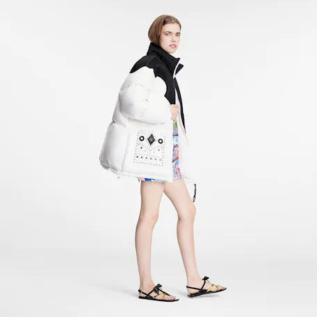 컬렉션 특유의 웨스턴풍 디테일로 재해석한 과장된 실루엣의 다운 재킷. 패딩 처리하여 볼륨감을 강조한 나일론 소재의 오버사이즈 핏. 구름 같은 포근함을 선사하는 디자인. 칼라에 접어 넣을 수 있는 실용적인 후드. 패션쇼에서 선보인 스터드가 달린 두 개의 양가죽 패치 포켓. 가죽 제품 컬렉션을 연상시키는 과감한 지퍼 풀러.