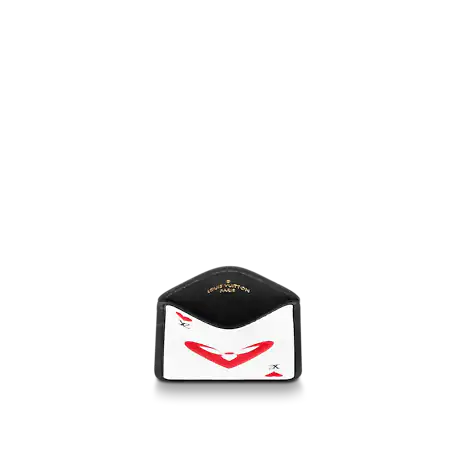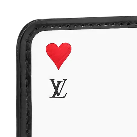 에피 가죽 및 모노그램 캔버스 소재로 제작한 게임 온 카드 홀더. 루이 비통의 아티스틱 디렉터 니콜라 제스키에르가 레디 투 웨어, 슈즈, 액세서리 및 가죽 제품을 아우르는 2021 크루즈 컬렉션에서 선보이는 아이템. 트럼프 카드에서 영감을 받은 화이트 색상의 배경과 레드 색상의 하트가 LV 이니셜 및 모노그램 플라워와 어우러진 디자인.