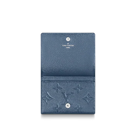 신용카드와 명함을 보관할 수 있는 우아한 엔벨로프 카르트 드 비지트. 무지갯빛이 도는 네이비 블루 색조의 그레인 모노그램 앙프렝뜨 가죽 소재. 대부분의 포켓에 쏙 들어가는 크기. 소지품을 안전하게 지켜주는 프레스 스터드 잠금장치.