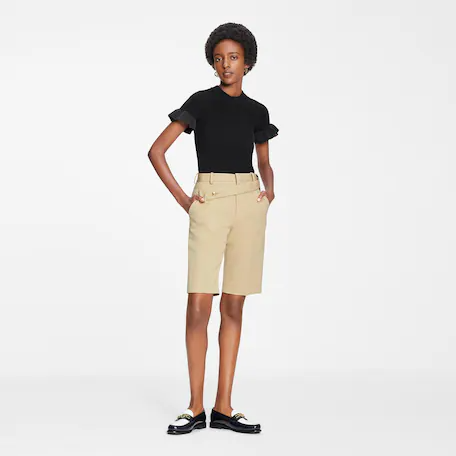 루이 비통의 현대적인 테일러링이 돋보이는 버뮤다 쇼츠. 고급스러운 울 개버딘 소재로 완성한 날렵하고 세련된 실루엣. 전통적인 수트의 디테일을 새롭게 풀어낸 디자인. 도전적인 분위기를 선사하는 각진 형태의 오버래핑 벨트. 하우스만의 감각이 엿보이는 허리 부분의 오버사이즈 모노그램 캔버스 벨트 루프.
