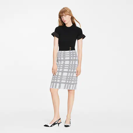 그래픽하고 현대적인 무릎 길이의 니트 스커트. 이번 컬렉션 특유의 강렬한 투톤 색조로 트위드 특유의 질감을 구현한 아이템. 면 및 울 혼방 소재로 완성한 세련되고 간결한 실루엣. 대조적인 리브드 디테일의 웨이스트 밴드를 구성하여 편안한 착용감을 선사하는 디자인. 루이 비통 고유의 감성이 엿보이는 모노그램 캔버스 탭.