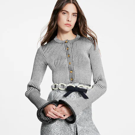 이번 컬렉션에서 선보이는 매력적인 데일리 스타일을 차분하면서도 그래픽한 감각으로 풀어낸 니트 가디건. 은은한 트롱프뢰유 효과를 더한 촘촘한 리브드 니트 소재로 완성한 크롭 길이의 디자인. 세련되고 타이트한 실루엣을 더욱 강조하는 우아한 트럼펫 소매. 하우스 고유의 감성을 자아내는 앞면의 골드 톤 LV 월계관 버튼.