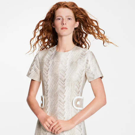 반짝이는 루렉스 헤링본 자카드 소재의 세련된 반소매 드레스. 클래식한 패턴에 은은한 색조의 차분하고 현대적인 모티프를 전체적으로 입혀 현대적으로 재해석한 아이템. 스쿠버 저지 소재의 트리밍과 원뿔 모양의 버튼을 더한 마르탱갈 디테일로 허리 부분을 강조한 디자인. 컬렉션 특유의 대조적인 오버사이즈 노출 지퍼를 구성한 뒷면.