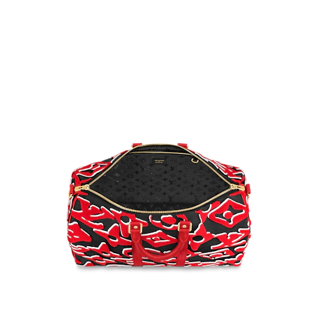 LV x UF 컬렉션에서 일곱 가지 스페셜 에디션 백 중 하나로 선보이는 강렬한 매력의 키폴 반둘리에 45. 스위스 출신 아티스트 우르스 피셔가 재해석한 레드 및 블랙 색상의 모노그램 모티프가 예술적인 분위기를 자아내는 아이코닉한 위켄더 백. 독특한 질감을 선사하는 벨벳처럼 부드러운 입체 패턴. 수집가의 마음을 사로잡을 아이템.